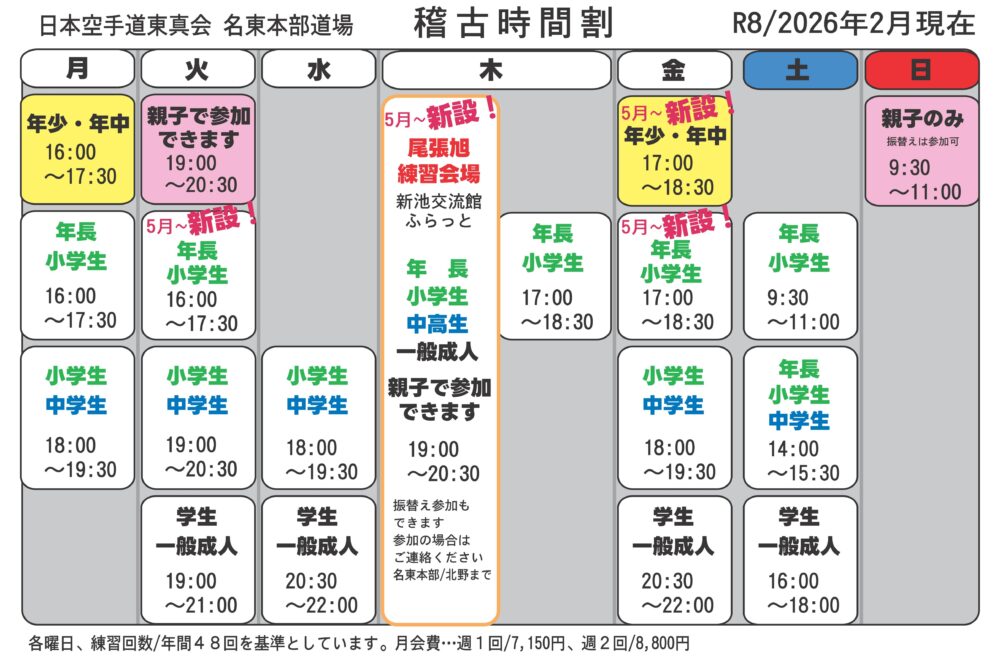 | 開催時間 土曜日 17:45~19:15 場所 コナミスポーツクラブ鳴海山下 少年部 お問い合わせ下さい 年長~ 一般部 お問合せ下さい | ||
